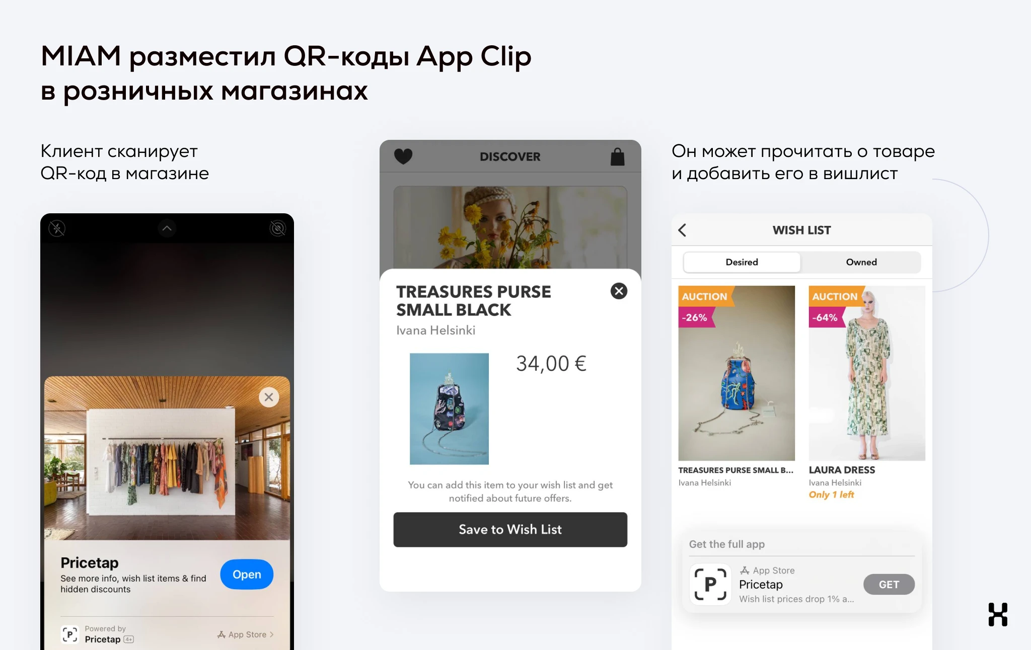 Модный бренд MIAM в Хельсинки разместил QR-коды мини-приложения Pricetap в магазинах, чтобы предложить клиентам дополнительную ценность. Приложение рекомендует, как сочетать одежду и аксессуары, а также предлагает добавлять понравившиеся товары в виш-листы и потом покупать их со скидкой.