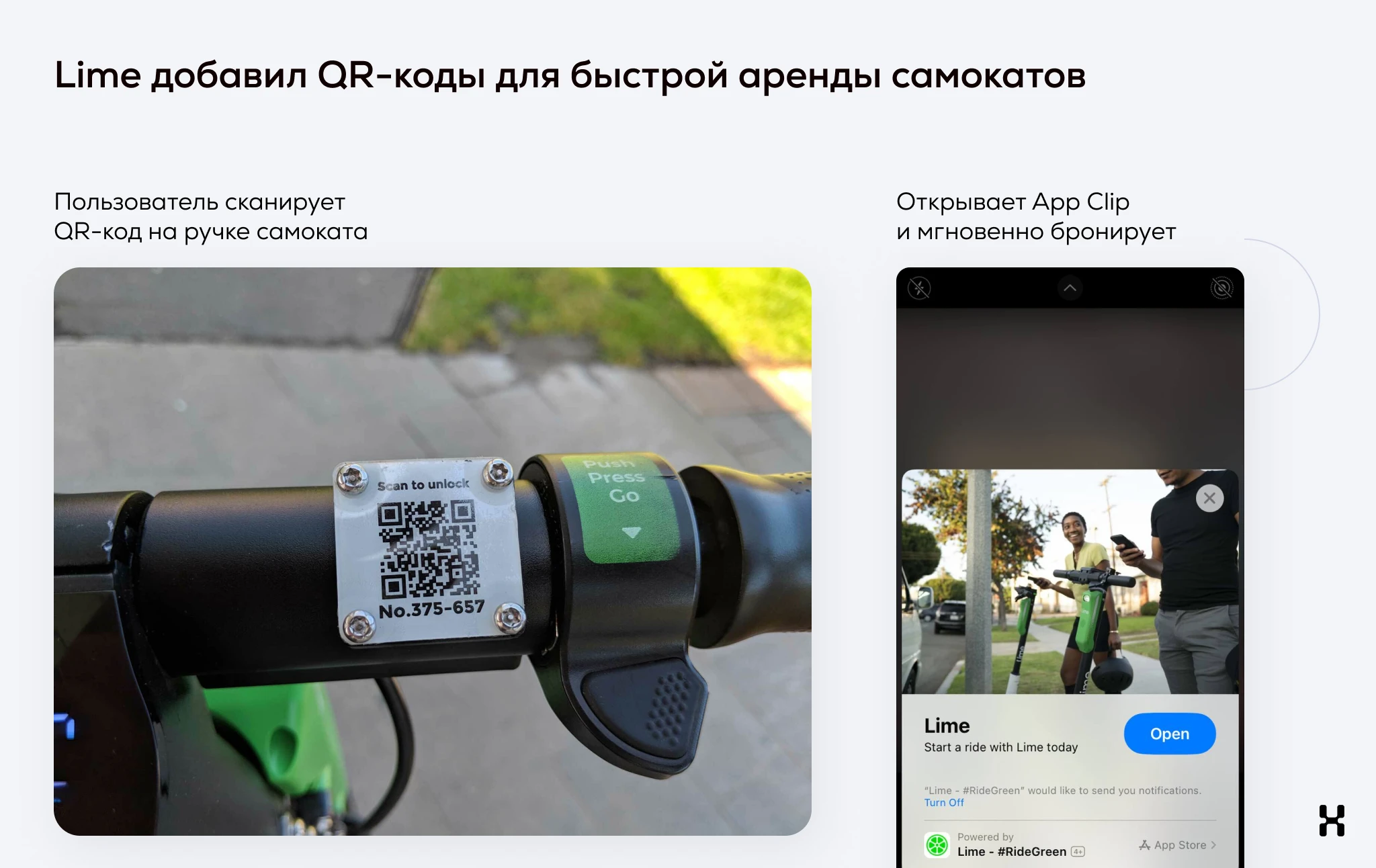 Lime упростил этот процесс. Пользователю достаточно отсканировать QR-код на самокате или приложить айфон к NFC-метке, чтобы начать поездку: весь процесс занимает не более 5 секунд.