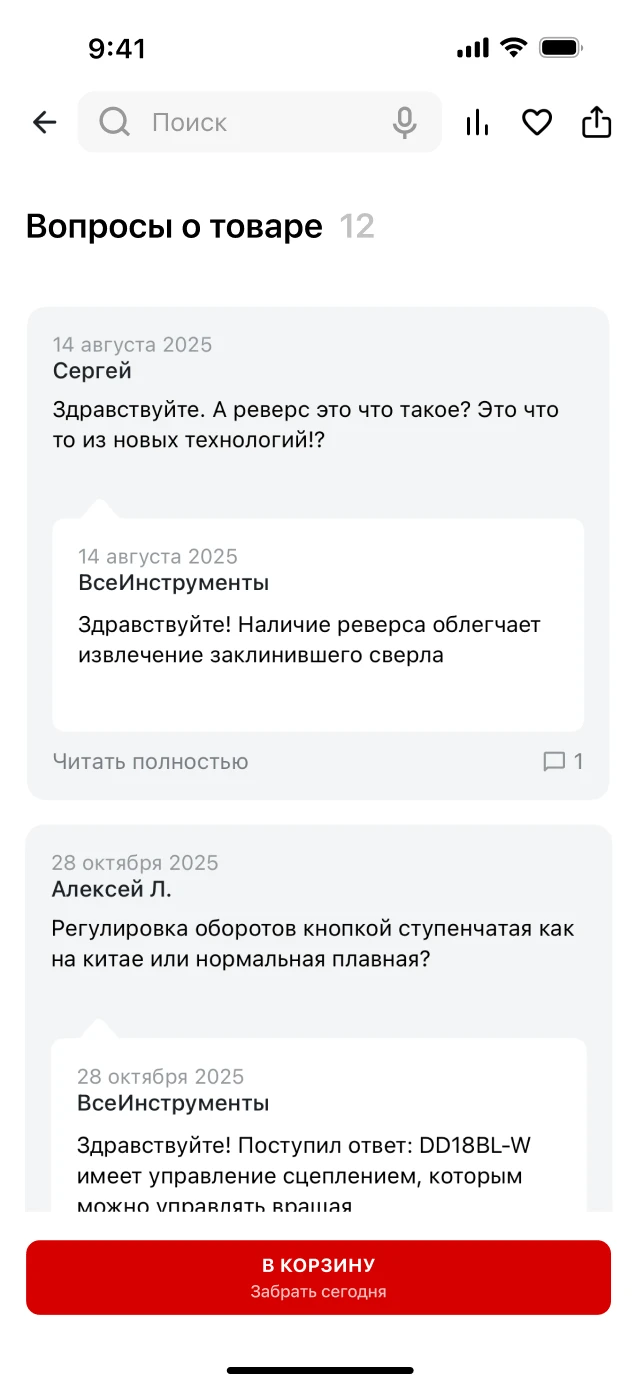 поиск подсказывает товары уже по первым слогам; а во время ремонта, когда неудобно печатать, можно просто сказать — голосовой поиск все найдет.
