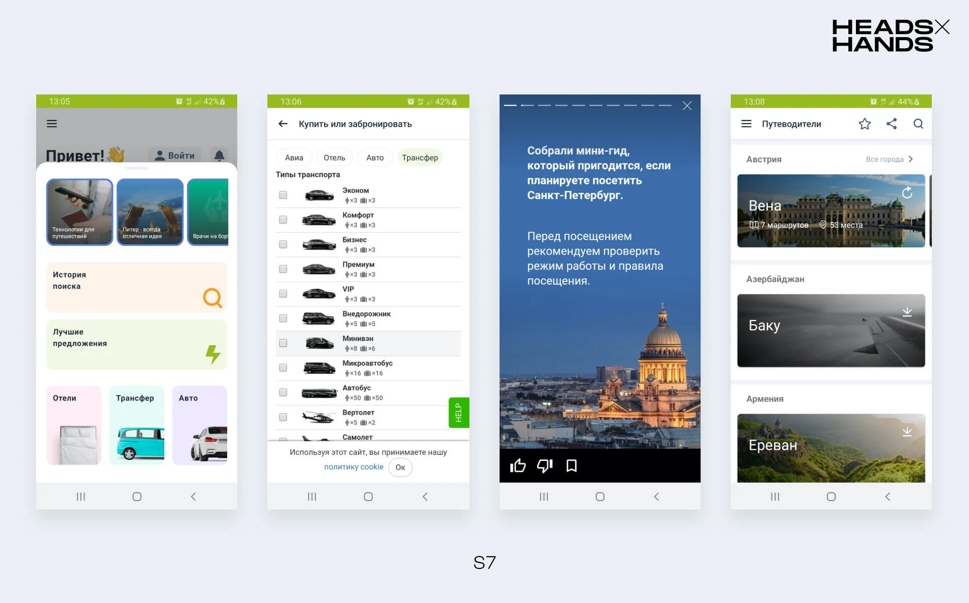 S7. Авиакомпания S7 выстраивает вертикаль сервисов для путешествий и предлагает больше услуг через приложение, чем Аэрофлот. В нем можно найти и забронировать отель, заказать трансфер, арендовать автомобиль. Сервисы предоставляются партнерами компании: Booking.com, Rentalcars.com, Gettransfer. Контент о путешествиях, компании и сервисе выведен в ленту со сторис. Как и у Аэрофлота, есть путеводители по городам мира. Удобно, что статьи посвящены отдельным местам и маршрутам, и их можно добавить в избранное.