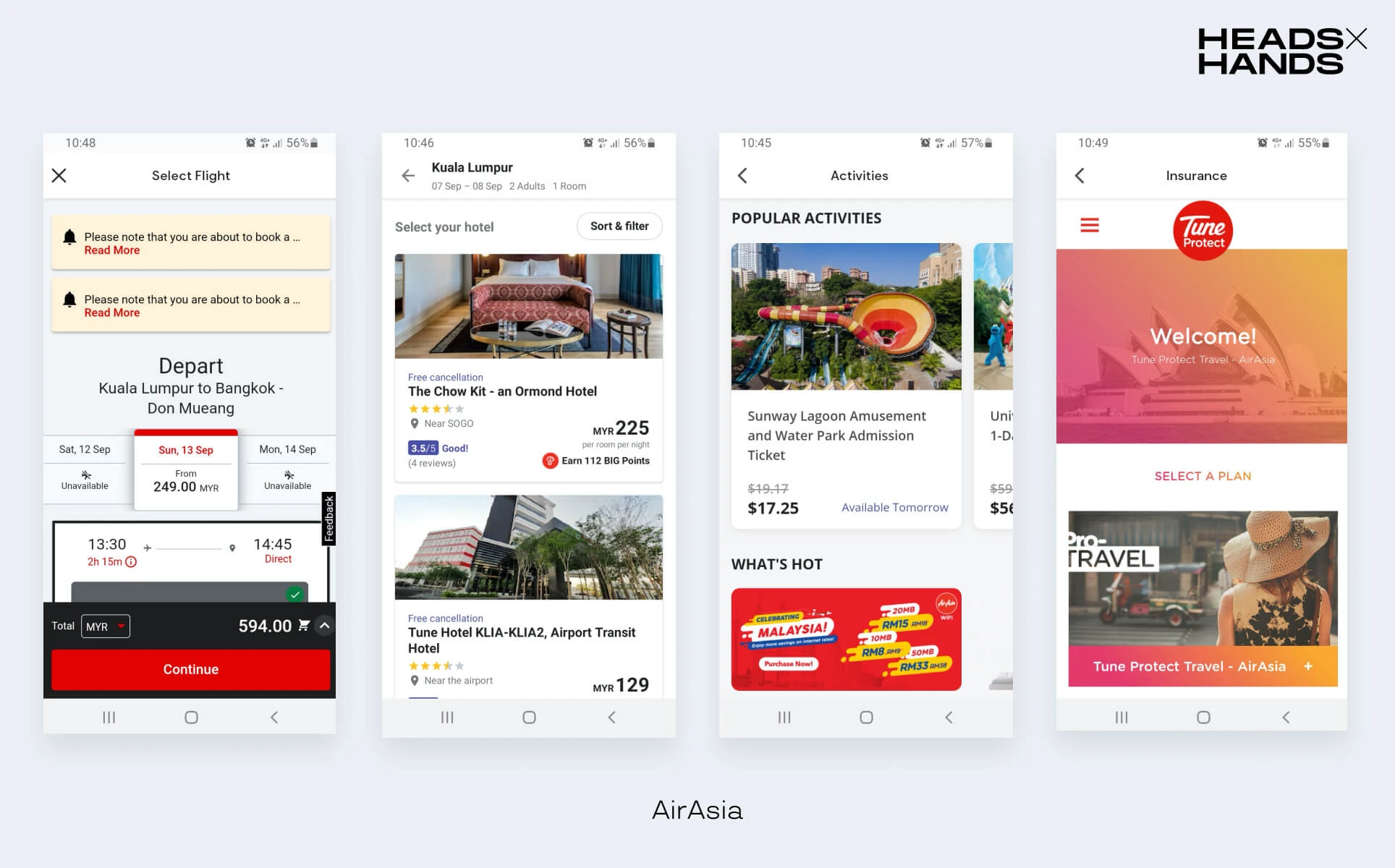 Туристические сервисы в приложении AirAsia: покупка авиабилетов и страховок, бронирование отелей, поиск и бронирование развлечений.