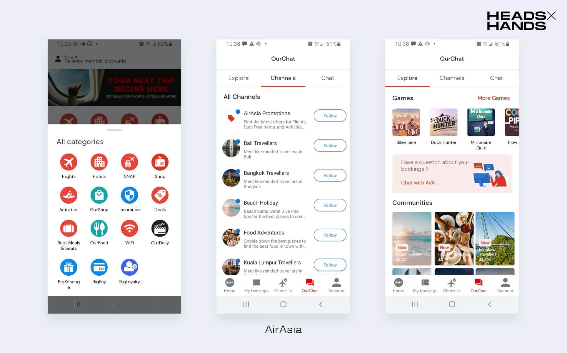 Все сервисы в супер-аппе AirAsia, разделы с чатами и играми