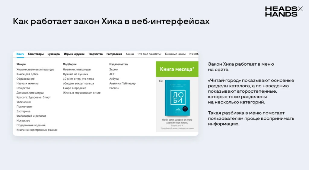 Закон Хика часто применяется при проектировании меню на сайтах так: выделяют крупные, основные разделы товаров или услуг, а внутрь них помещают мелкие, уточняющие разделы.